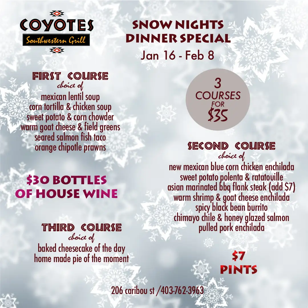 Coyotes Southwestern Grill offers the perfect setting for dinner in Banff. Try our blue corn chicken enchilada, pan-seared fish tacos and orange chipotle prawns.